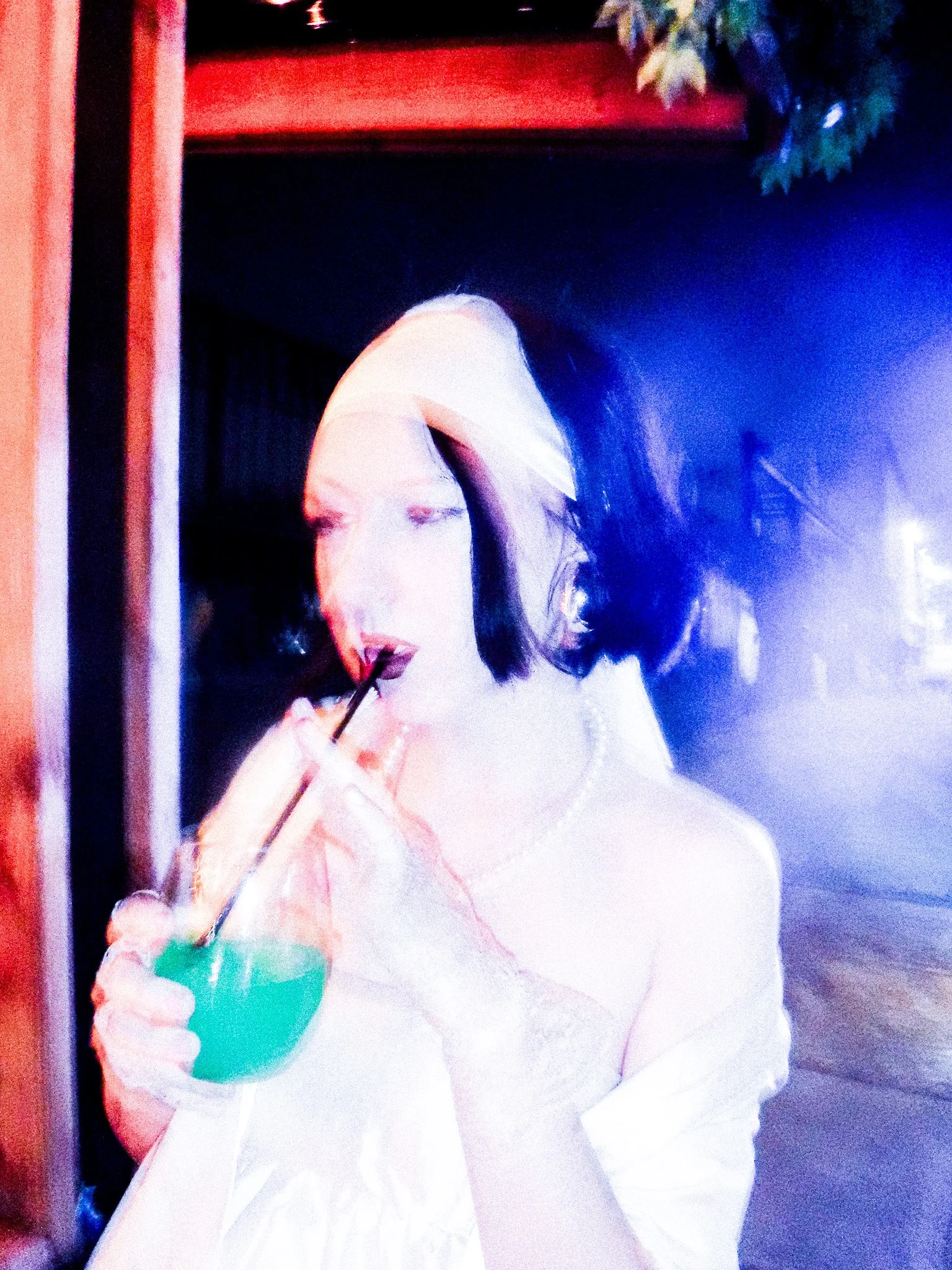 dress & matching headscarf underneath: strapless with boning & gathered skirt